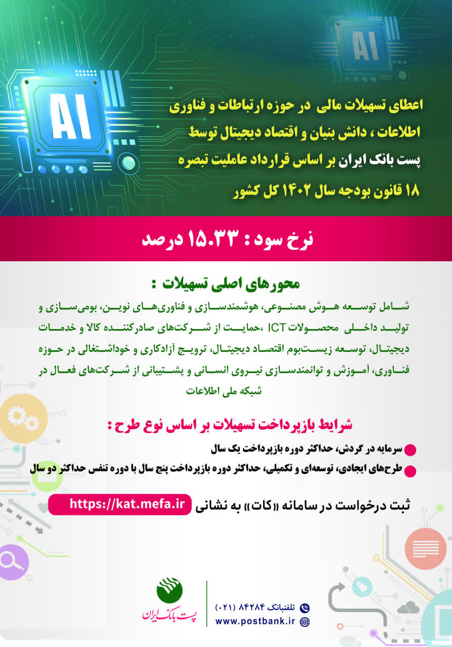 اعطای تسهیلات مالی در حوزه ارتباطات و فناوری اطلاعات، دانش بنیان و اقتصاد دیجیتال توسط پست بانک با نرخ سود ترجیحی. کلیه شرکت های فناور و دانش بنیان و اشخاص علاقمند با موضوع مرتبط می توانند با ثبت درخواست از این تسهیلات استفاده نمایند.